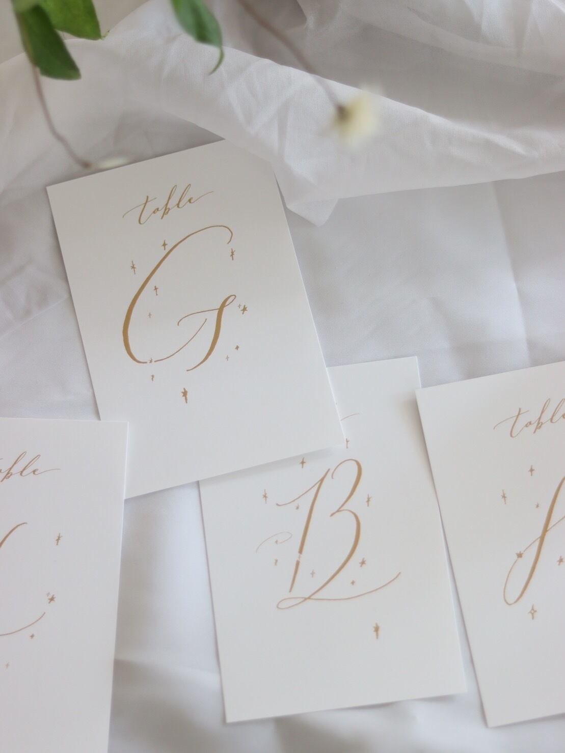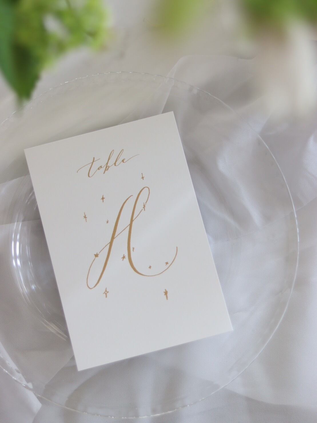 アルファベットに星のモチーフがあしらわれたオリジナルのテーブルナンバー。